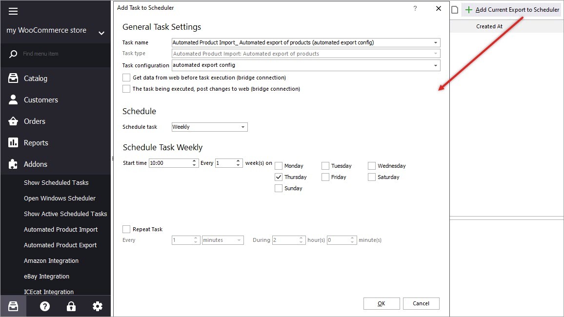 In the scheduler window specify time interval for WooCommerce cron export to be running and its regularity.
