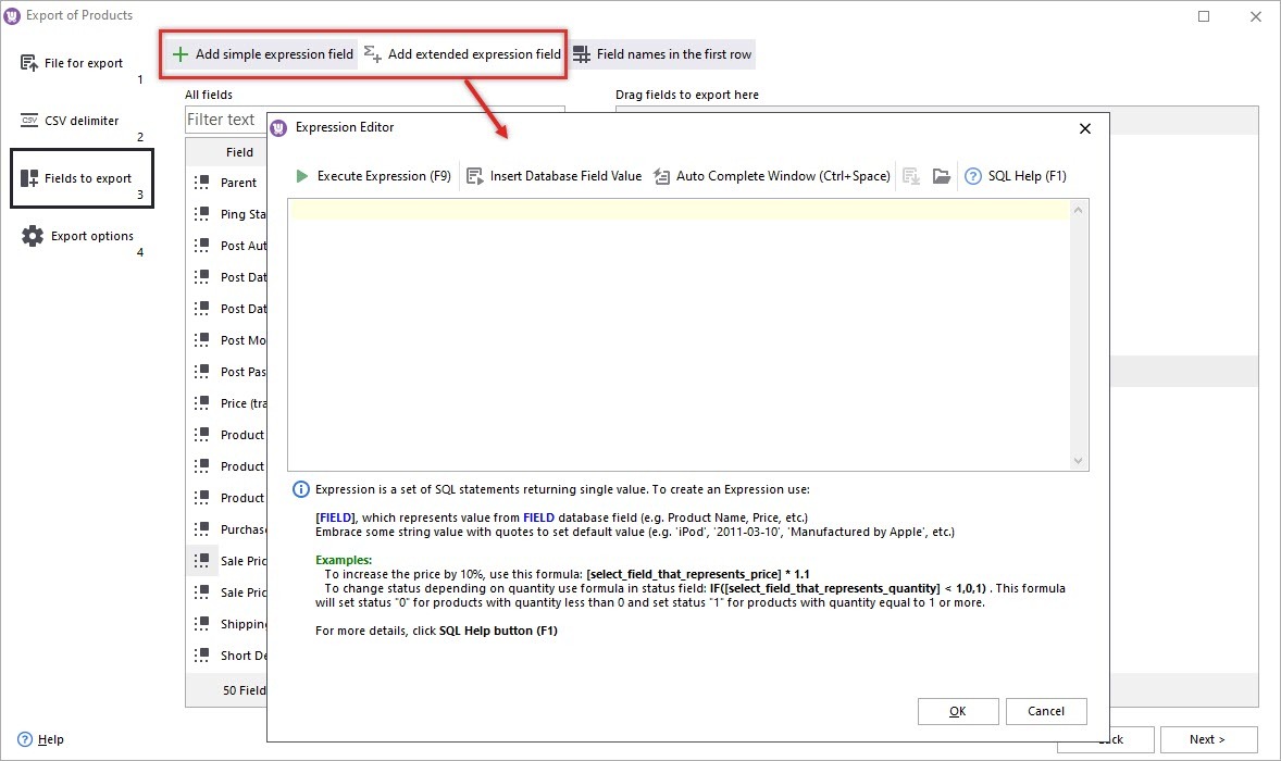 With special expression formulas you can go deeper and adjust your file to the necessary format right during export. For instance, you can merge fields, increase price or create custom SQL query to make complex modifications and dig into what you need to do.