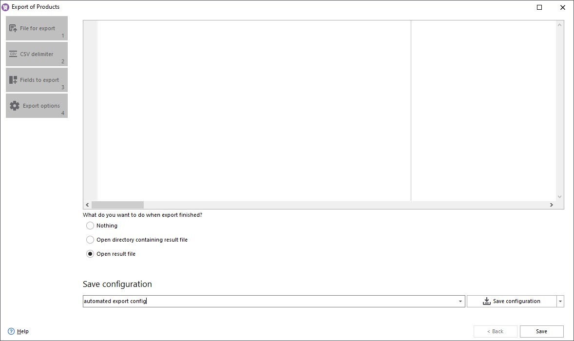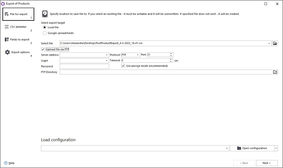 Opening further Export Wizard window, offers you an ability to re-name file in the way you want and select where your output spreadsheet with product data will be saved. Clicking button with three dots, you will see folders to select and save the file on your computer.