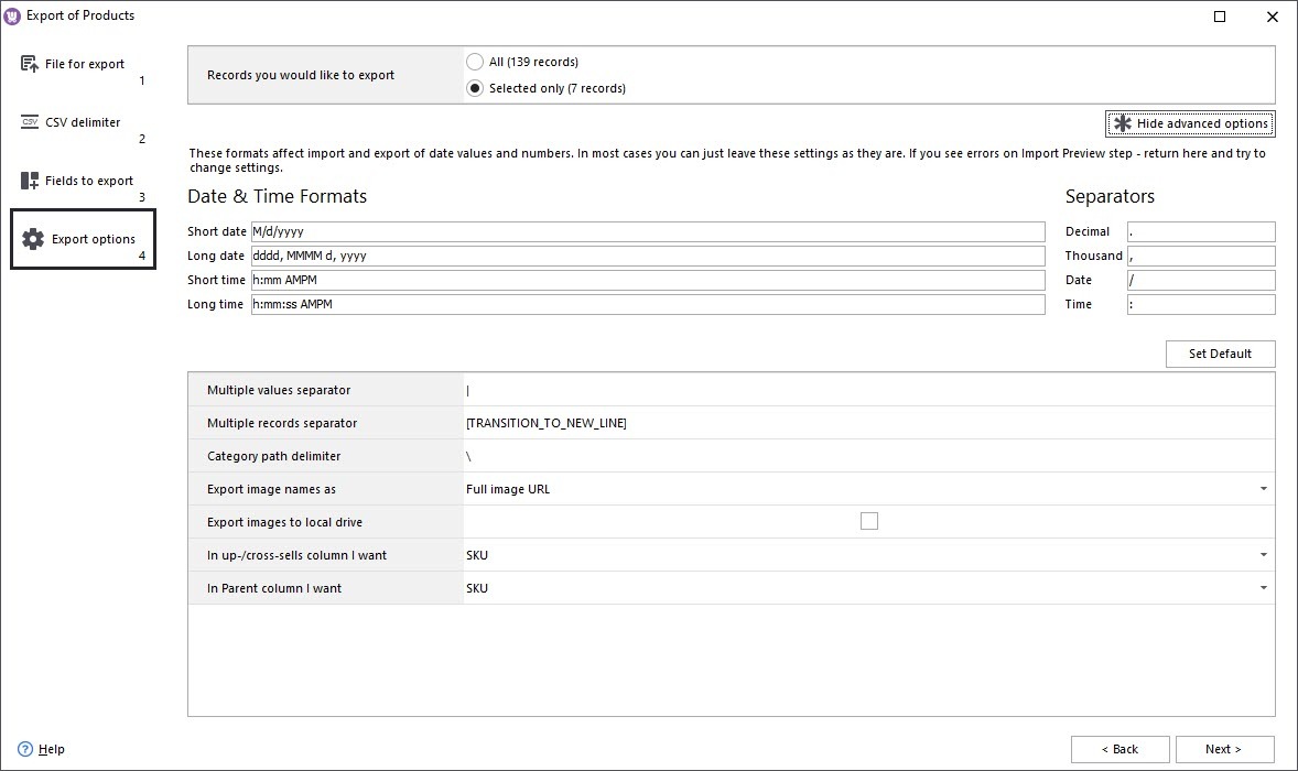 At the last step of the process you can also set additional parameters, like export full image URL, set category path delimiter or what type of relation to use for cross and upsells.