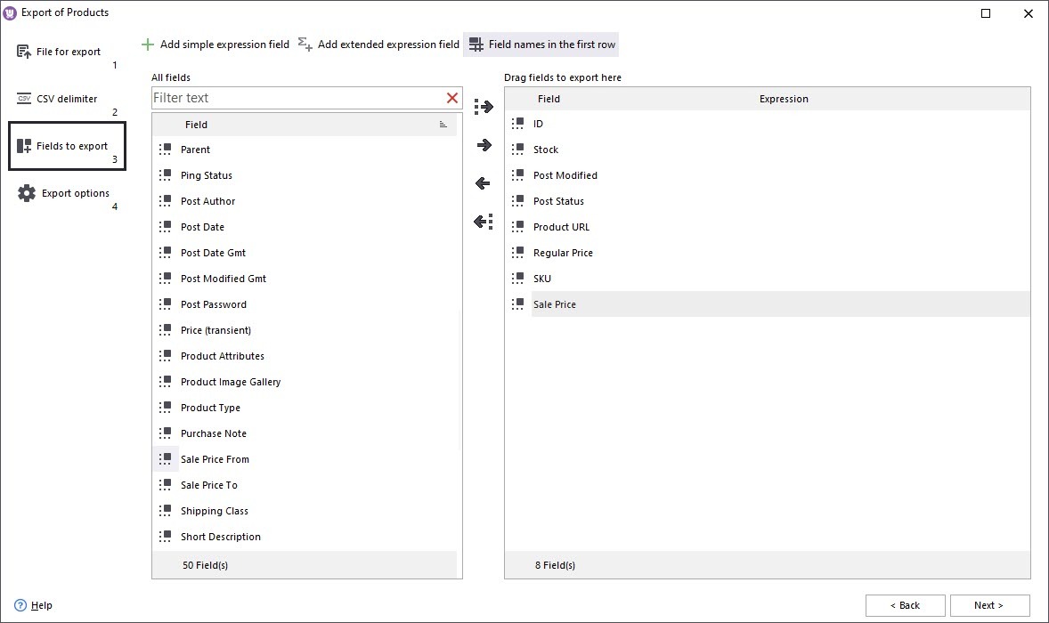 One of the most important steps is selection of exported fields. On the left you can see all of the data from your WooCommerce products and on the right is what will be brought to your CSV file. Simply drag and drop fields from the left to the right to build your customized file.