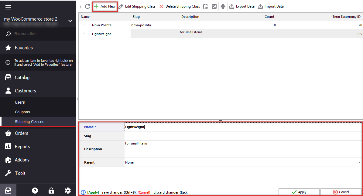 - Press "Add New" on the toolbar and input all shipping class related details to make the record complete and recognizable.