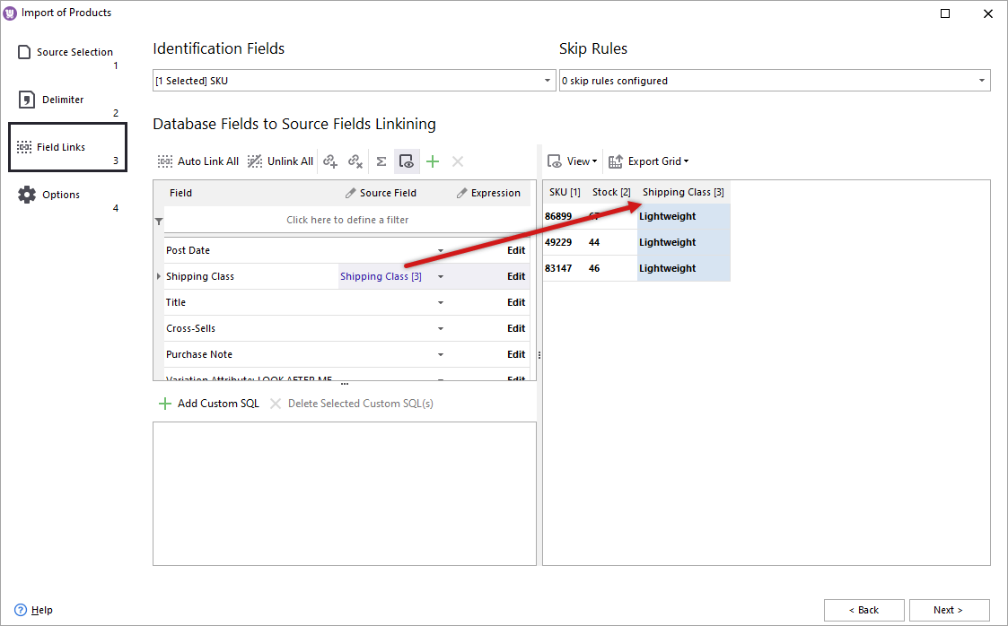 - Select Shipping Class field in the dropdown list of fields;