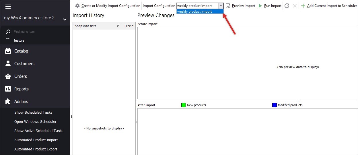 To get import performed automatically you need to create scheduled task. Once the configuration for WooCommerce product import is created, add it to scheduler in the following way: