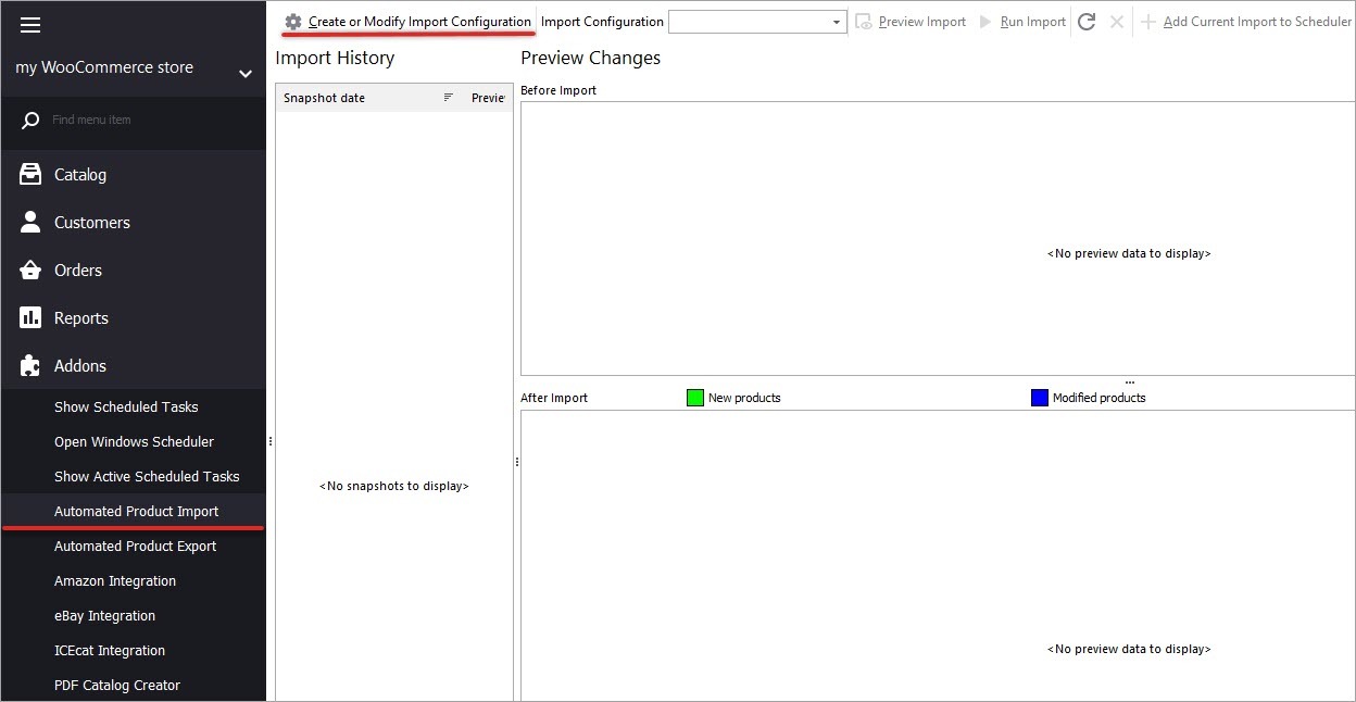 - Open WooCommerce import wizard pressing "Import Data" button on the product toolbar or navigate to Addons->Automated Product Import and click "Create or Modify Import Configuration" button.