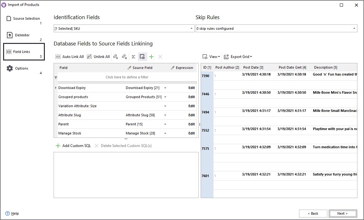 - Map fields from the file with database fields. If their names are identical use auto-mapping option to link them automatically. Select SKU as product identifier if you are creating new products via import, ID is suitable only for product update.