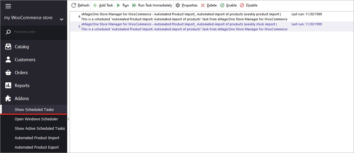 - Confirm task creation. This task will display in Show Scheduled Tasks section under Addons menu.