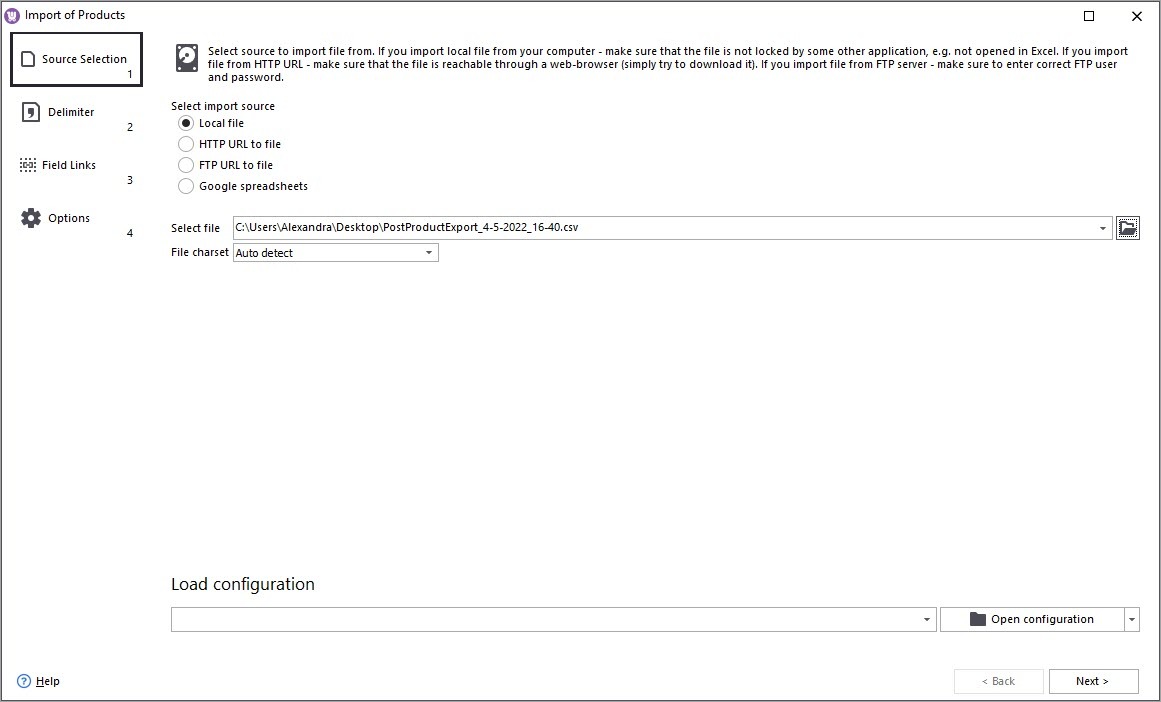 - Select the source of import file (local file, HTTP URL or FTP URL to file) and the file itself.