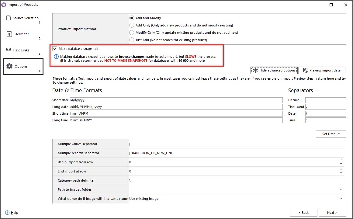 - Select import method and determine advanced import options. Detailed explanation of import methods and options is available in the post -