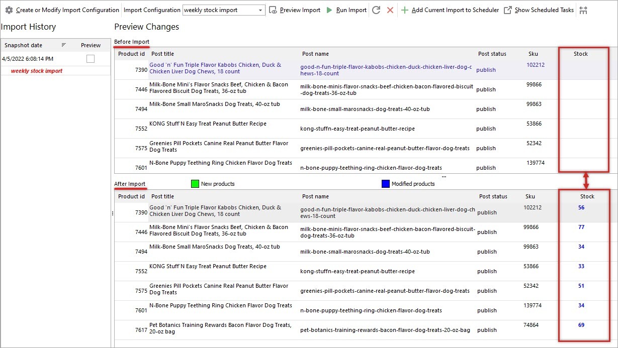 We have enabled snapshot option when creating import configuration and now can view the history and implemented changes. As the screenshot shows, product stock has been updated for imported products.