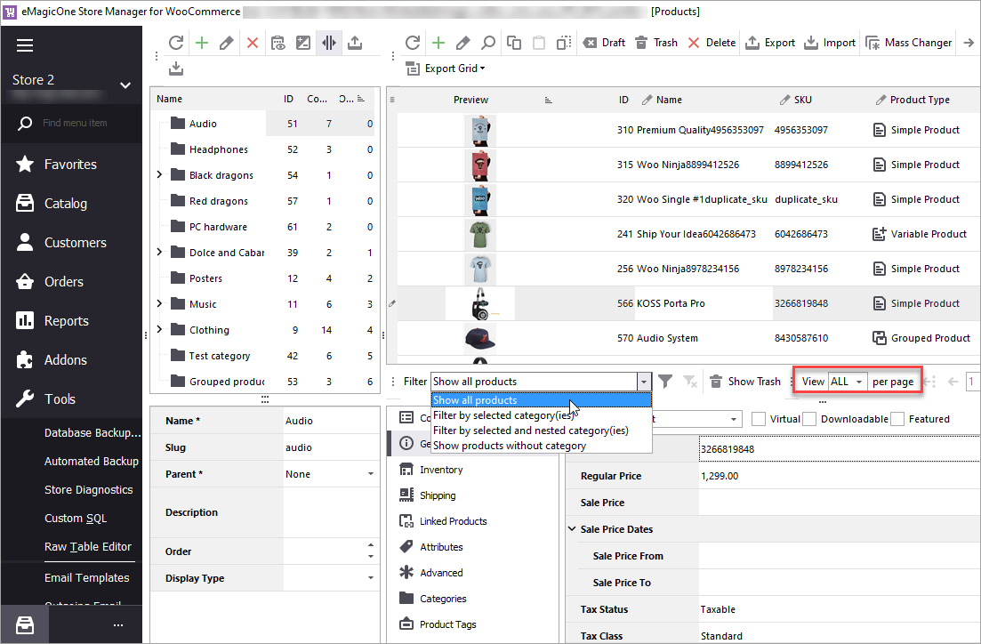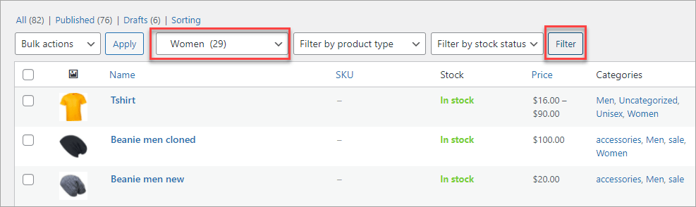 1. Open Admin panel and go to WooCommerce > Catalog > Products, then select a specific category and press Filter: