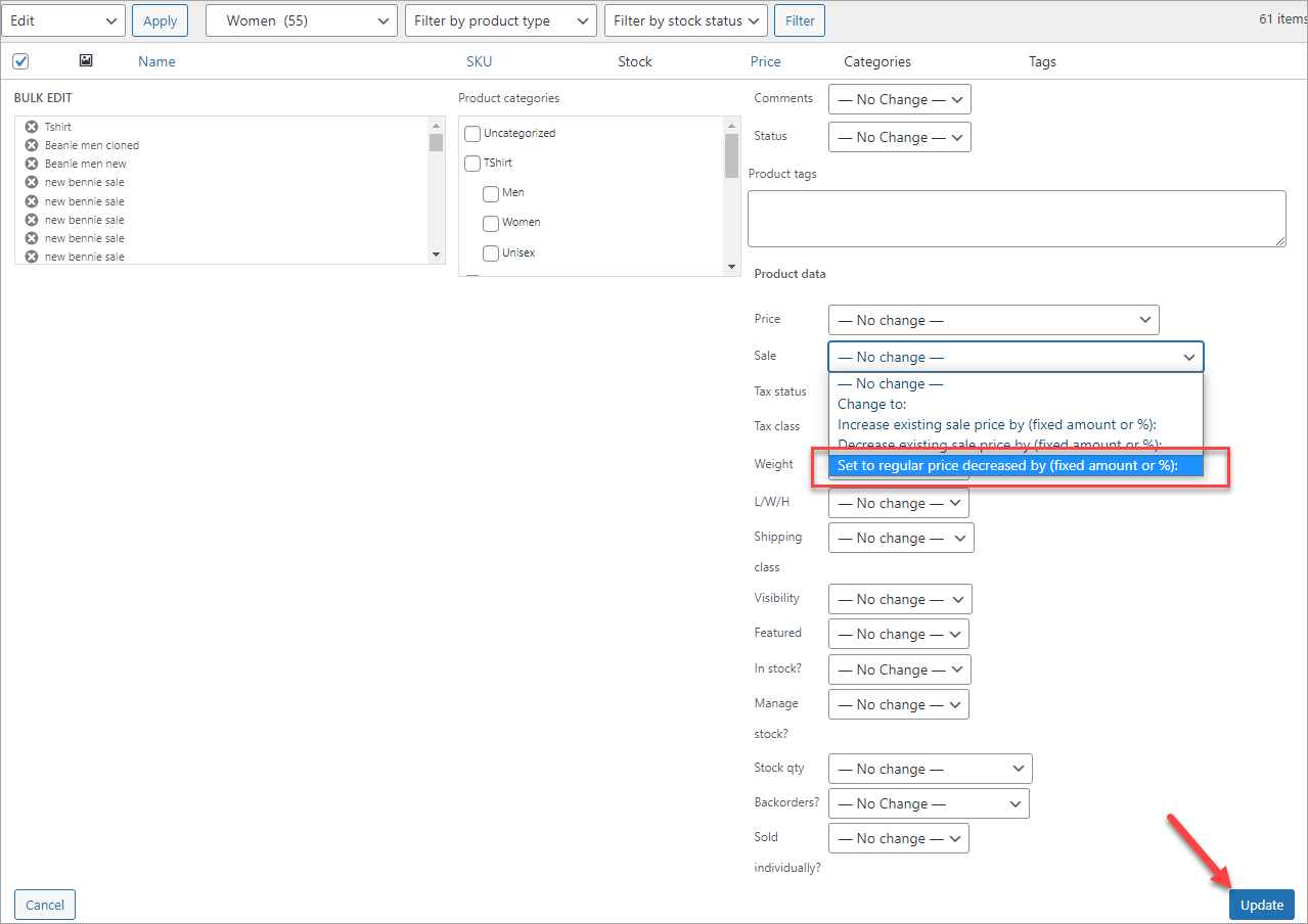 6. In the opened page, expand a drop-down for the Sale field and select the last option “Set to regular price decreased by”. Then enter a value or percent (with the % character) of the discount.