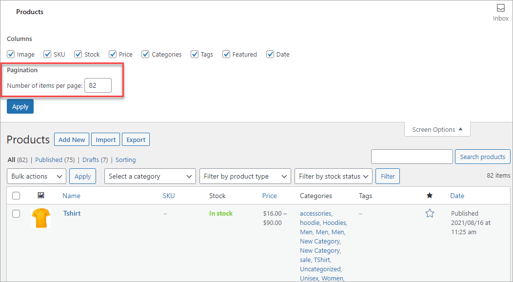 To do so, expand Screen Options, and under Pagination enter the number of products in your catalog. Click Apply.
