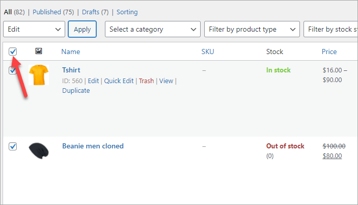 Now all your products are displayed on one page, and you can select them by ticking the checkbox at the top left: