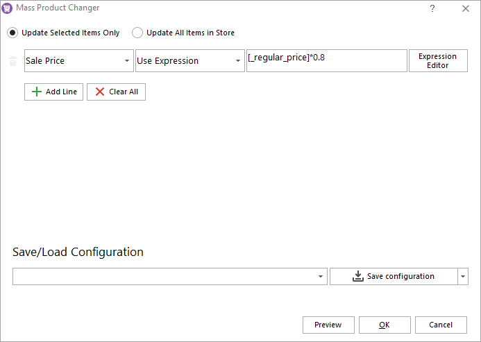 8. In the Mass Product Changer window, you can set the sale price for selected products. Select the Sale field in the first drop-down and use an SQL expression to set the sale price based on the regular price.