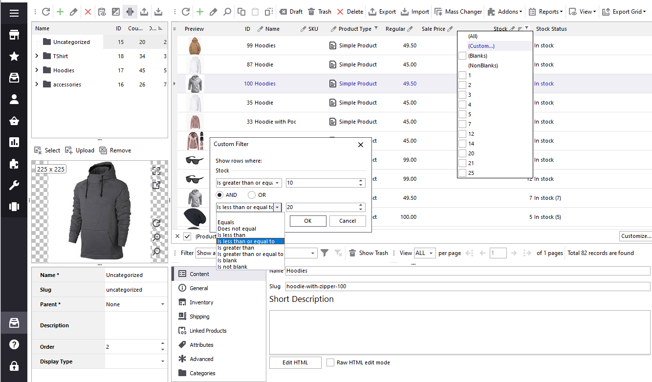 4. Go to Catalog > Products. In the Stock field filter, select Custom.... From the available conditions select the one you need. To filter products within the 10-20 stock range, we select the options Is greater than or equal to (10) and Is less than or equal to (20)