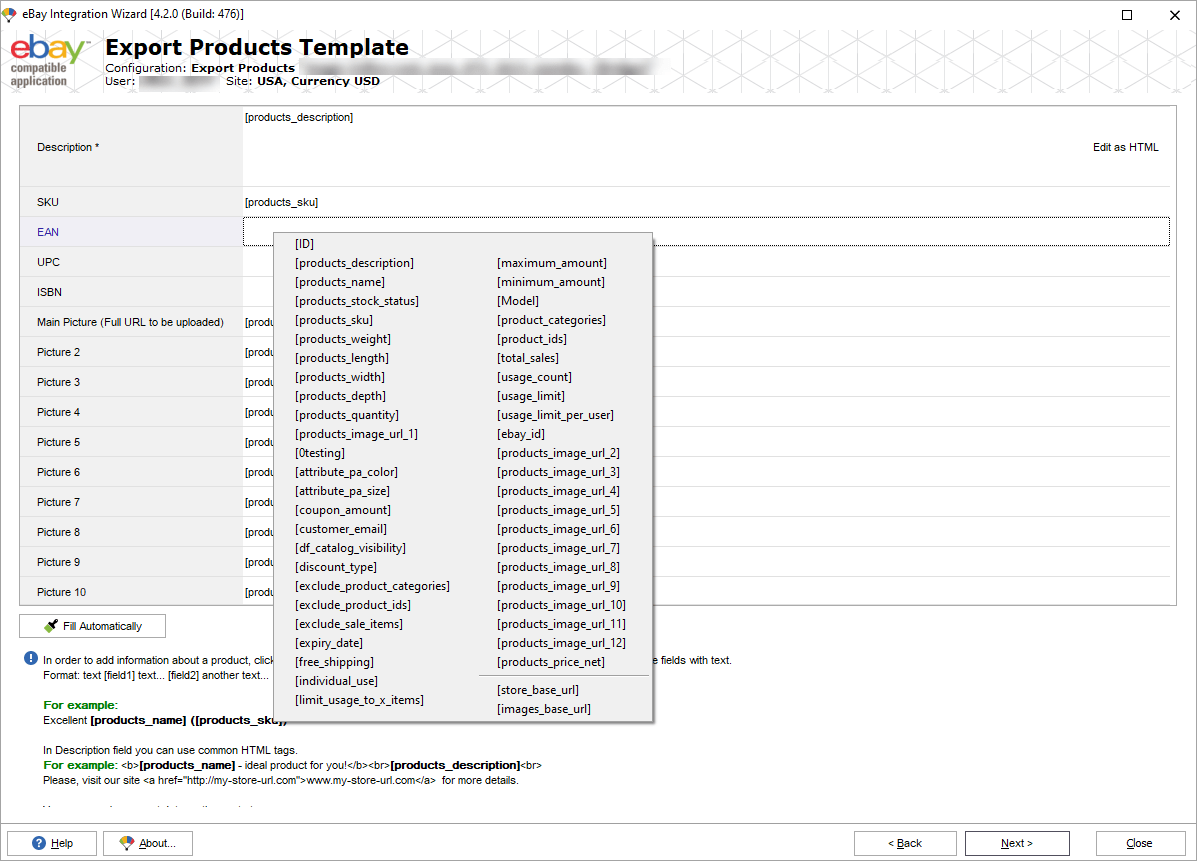 When the export wizard is launched, you’ll see your first export configuration on the left. In this step, you just have to specify the eBay site and currency. For a multilanguage website, you should also define the default language:
