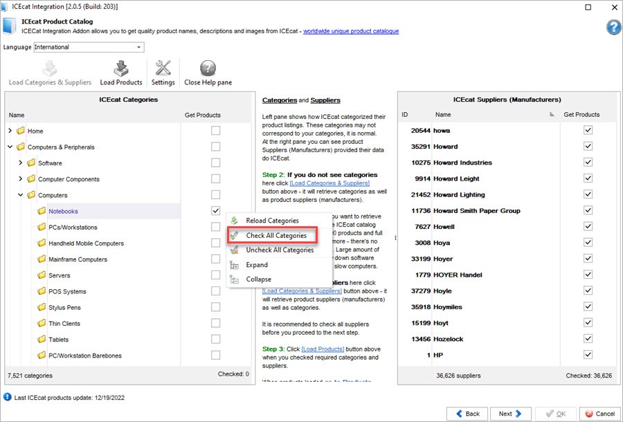 If ICEcat listings are not shown in this window, click on “Load Categories&Suppliers”. Note, the more categories you check, the more time it will take to retrieve the data. After you’ve made a selection, press “Next”.