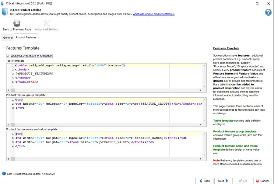 - Add product features from IСEcat. Some products on Icecat have the “Features” section with the detailed product specification. This data can be imported into the Description field in your store. For that, switch to the Features tab and select the “Add product features to description” check box: