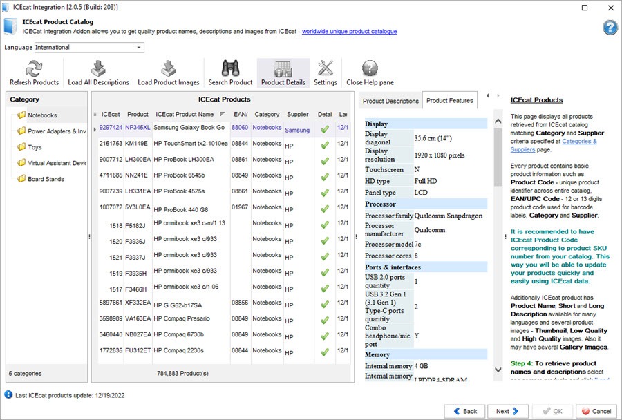 By default, the addon shows only basic information. You can load such ICEcat details as features, descriptions, and images by pressing corresponding buttons on the toolbar. After that, product descriptions and images will be displayed in the right pane in separate tabs.