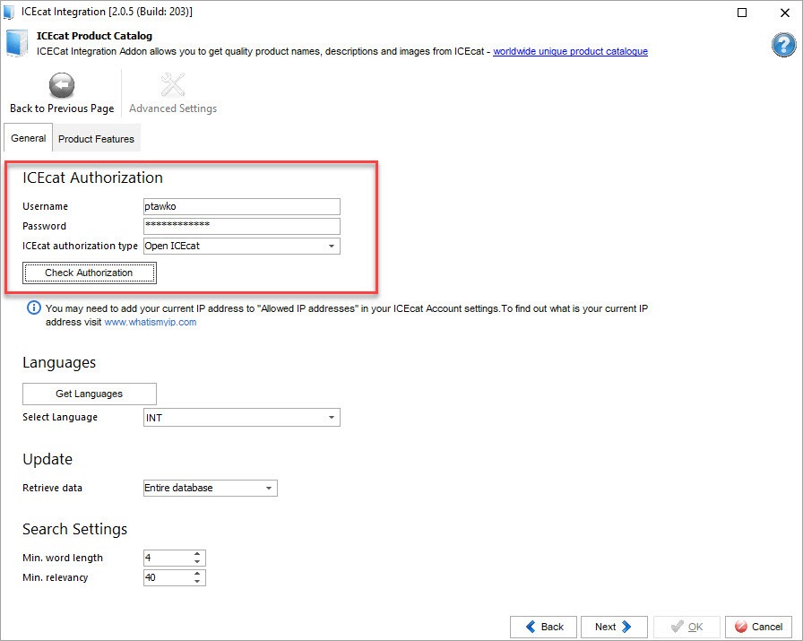 - In the addon, switch to the Setting > General tab. Here fill in your ICEcat account credentials. Then specify the type of ICEcat account - Open ICEcat (free) or Full ICEcat (paid). Finally, press Check authorization to make sure the addon has access to the catalog.