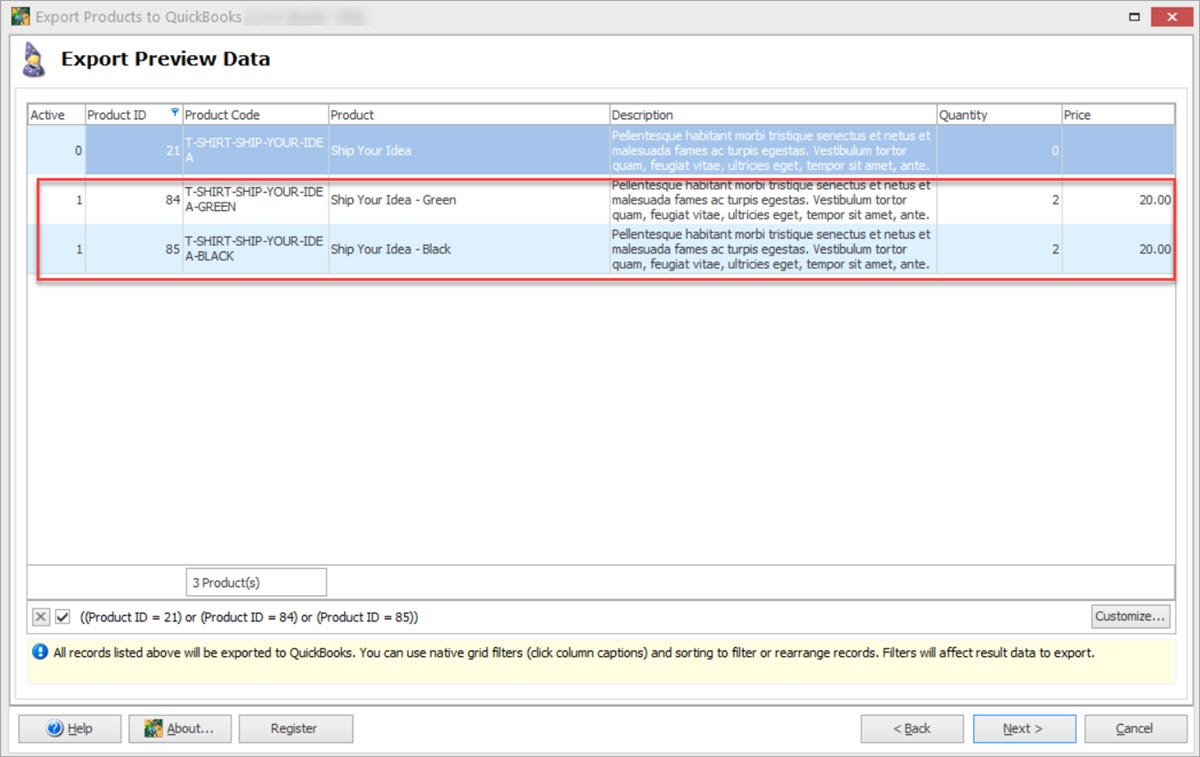 On the first step, you will see a list of products that will be exported to QuickBooks. If you want to proceed with it, click “Next”.