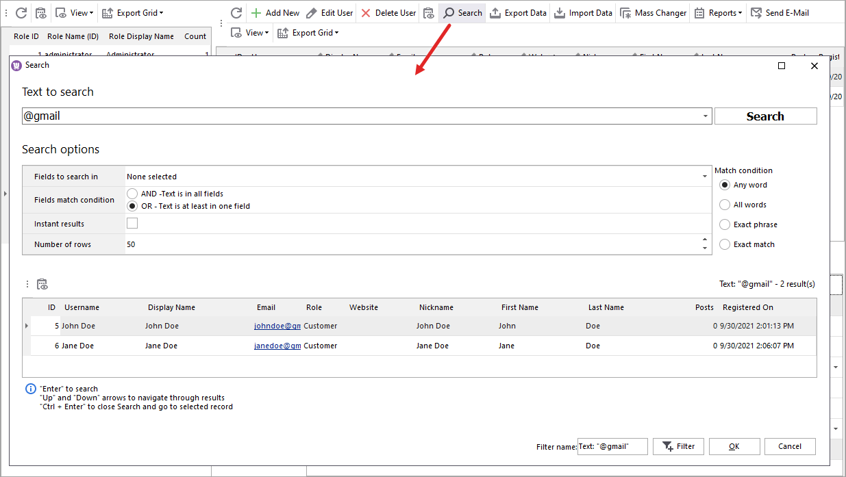 After you applied filter, you can additionally export your customer list, based on different applied criteria. You can export fields available in the Users grid to .txt, .xml, .html, .csv, .xls, .xls format or use ‘Export Data’ option to select from more fields to save to .csv.