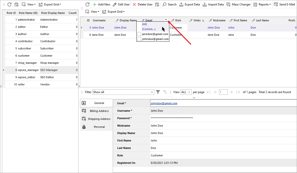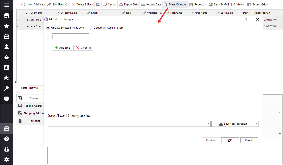 With Store Manager you can manage users individually or in bulk with built-in Mass Changer tool to better manage your WooCommerce customers. Mass changes are handy when you have a certain criteria to apply to multiple customers. For example, you can switch roles or set billing country, etc for selected users at once.