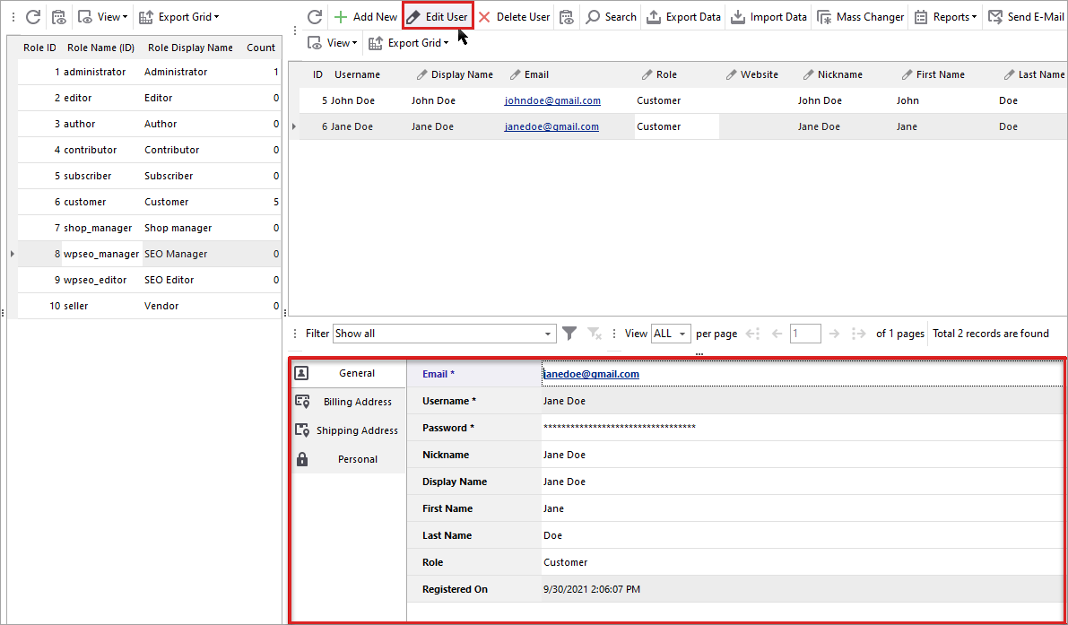 The existing users along with their personal info are available in ‘Users’ section, so you can quickly view customer personal data, like name, surname, website, date registered in the list. Moving through the user records, you can also see additional details on selected user, like billing, shipping address and personal info in the tabs of lower grid.