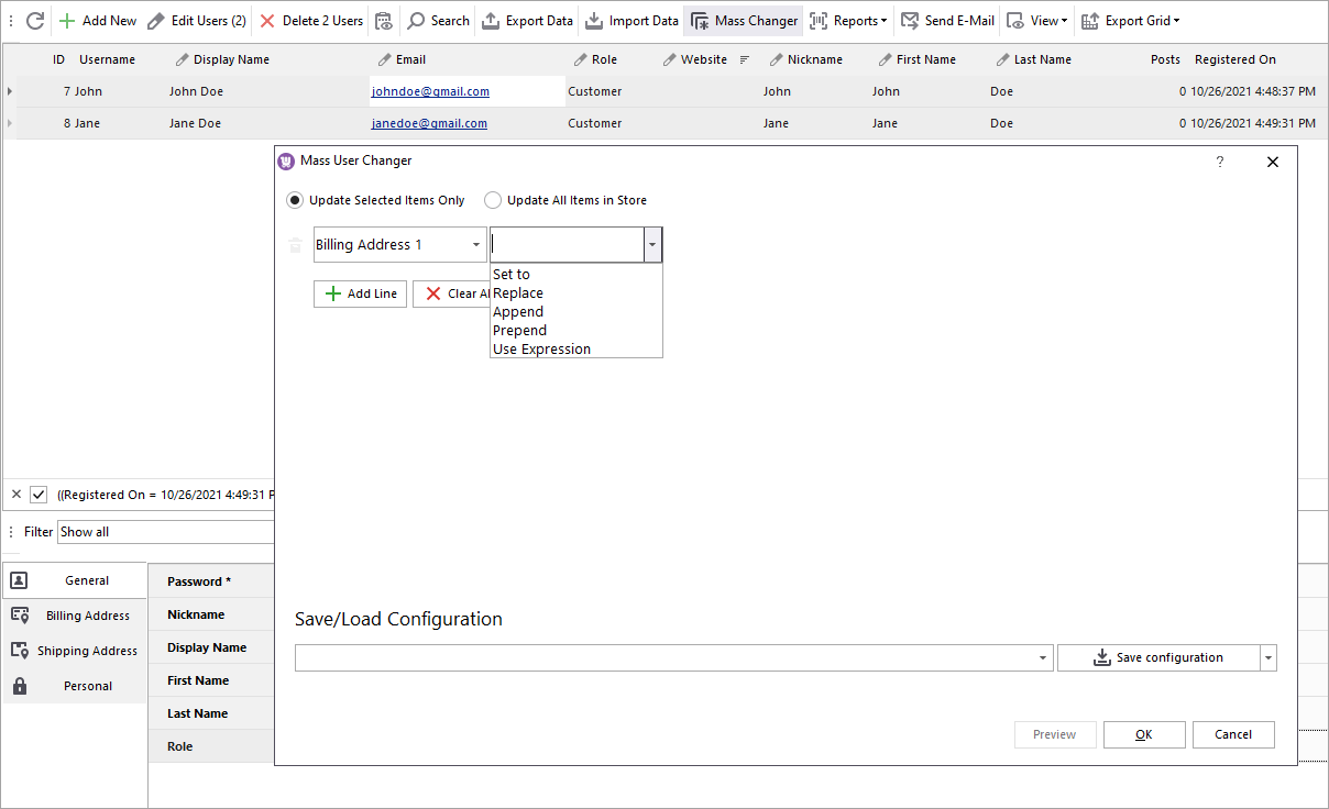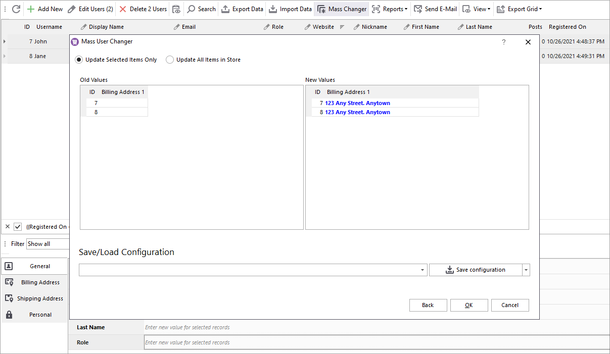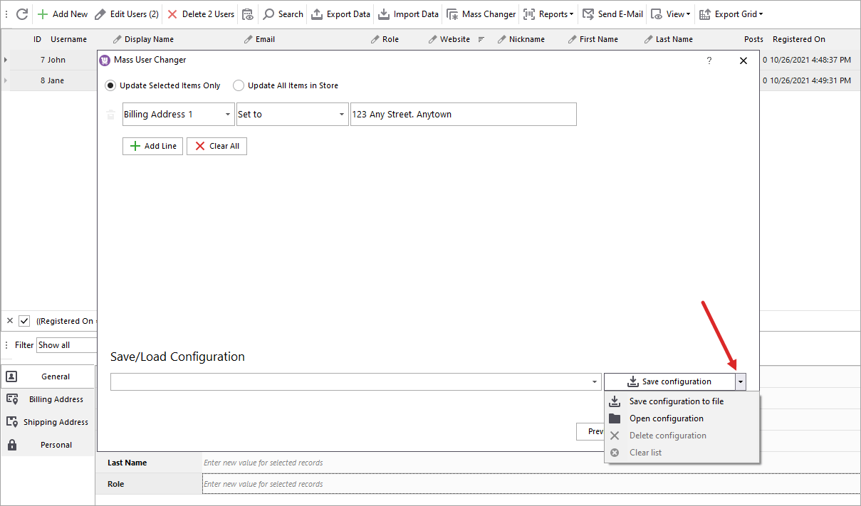 - If necessary, you can save the configuration to file and use it when performing further mass user modifications.