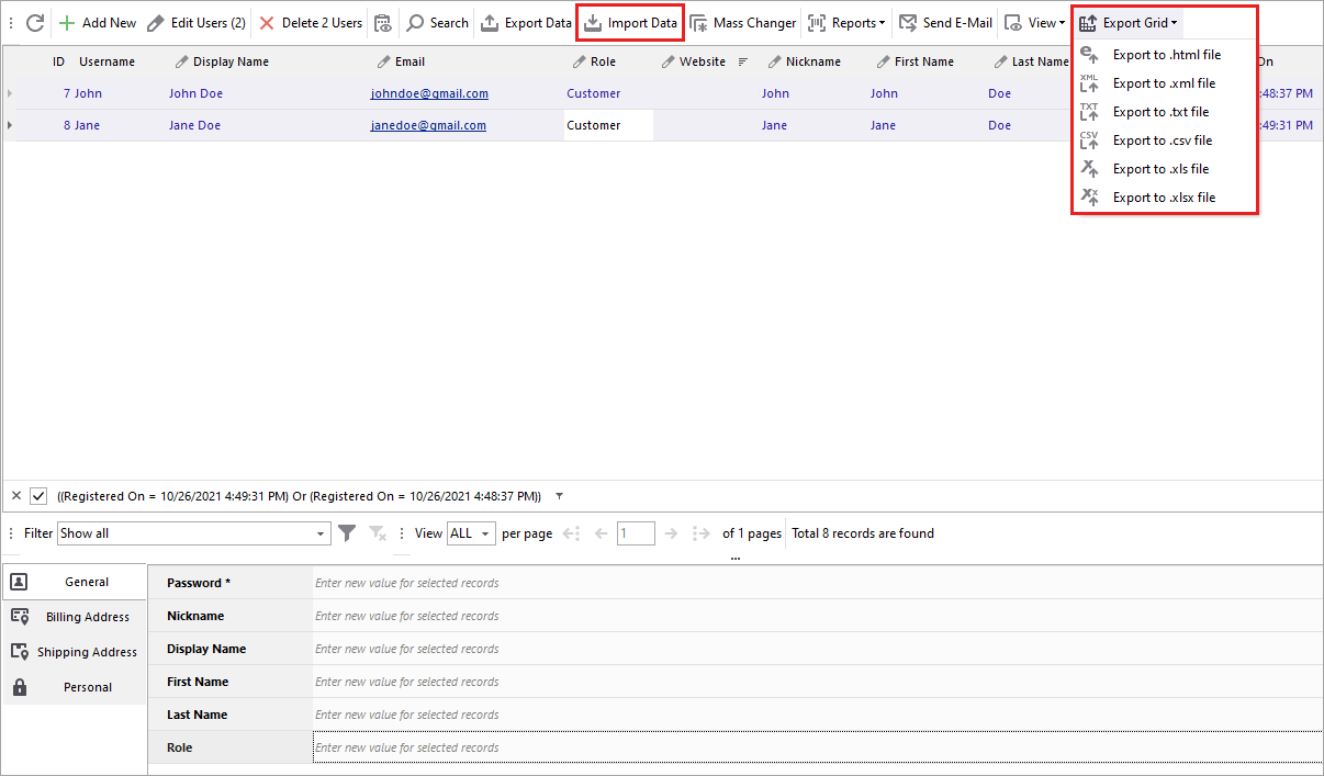 In addition, Store Manager allows exporting WooCommerce users data to .csv or exporting the whole grid containing users list to a range of formats. You can use this option, if you prefer working with spreadsheets. After that you can import the updated data as a .csv file via import wizard.