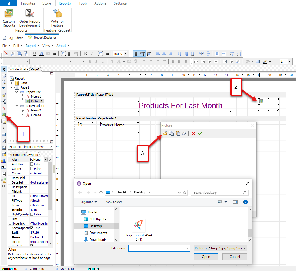 Now, let us add a company logo in the right corner of the report. For this, select Picture object and place the frame, where the image should be located. Click on the folder icon and choose the picture, previously saved on your PC.