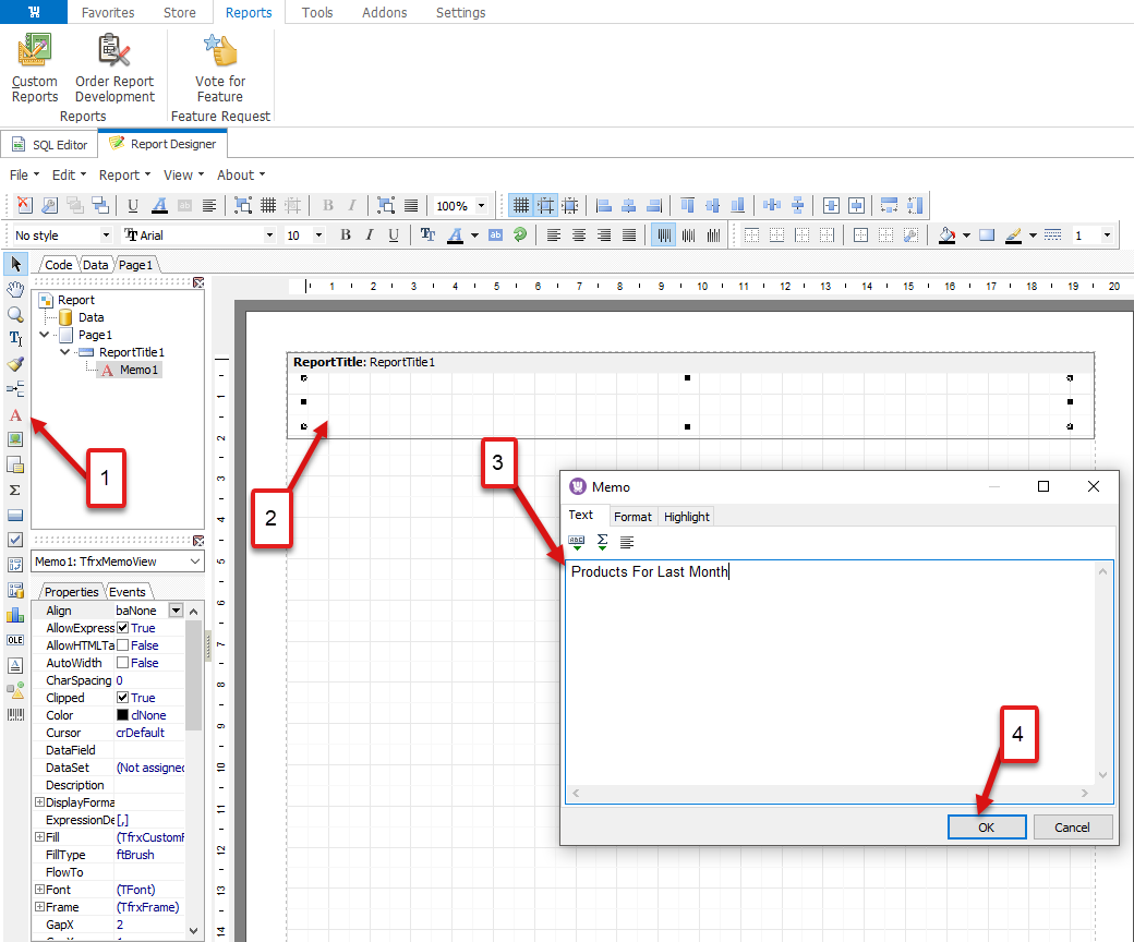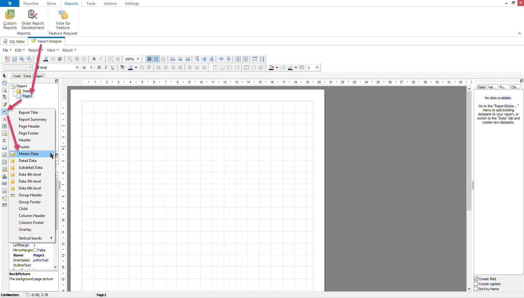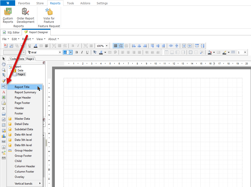 For instance, firstly, let us add a new band - Report Title, that will indicate what your WooCommerce report is about. You can do it on the left pane, go to Page1 ---> Insert Band ----> Report Title.