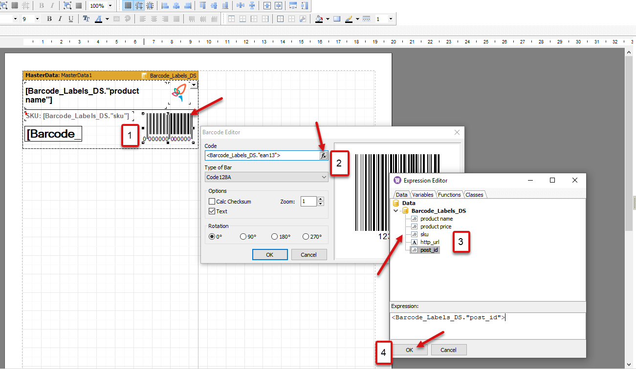 Press “fx” button in the Code option and select the needed identifier from Data tab. Designate the barcode depending on your requirements in Type of Bar, Options and Rotation.