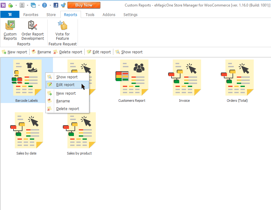 The documents you receive with the installation of Store Manager are available for usage and can be modified according to your needs. For example, let’s take a Barcode Labels report. Let’s say, you want to change the code, your barcode labels will be generated from. For this, press Edit report button from the context menu on the highlighted document.