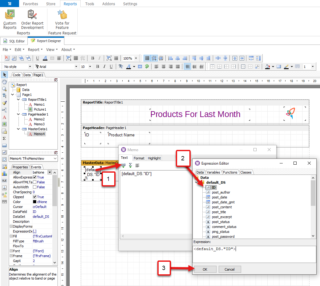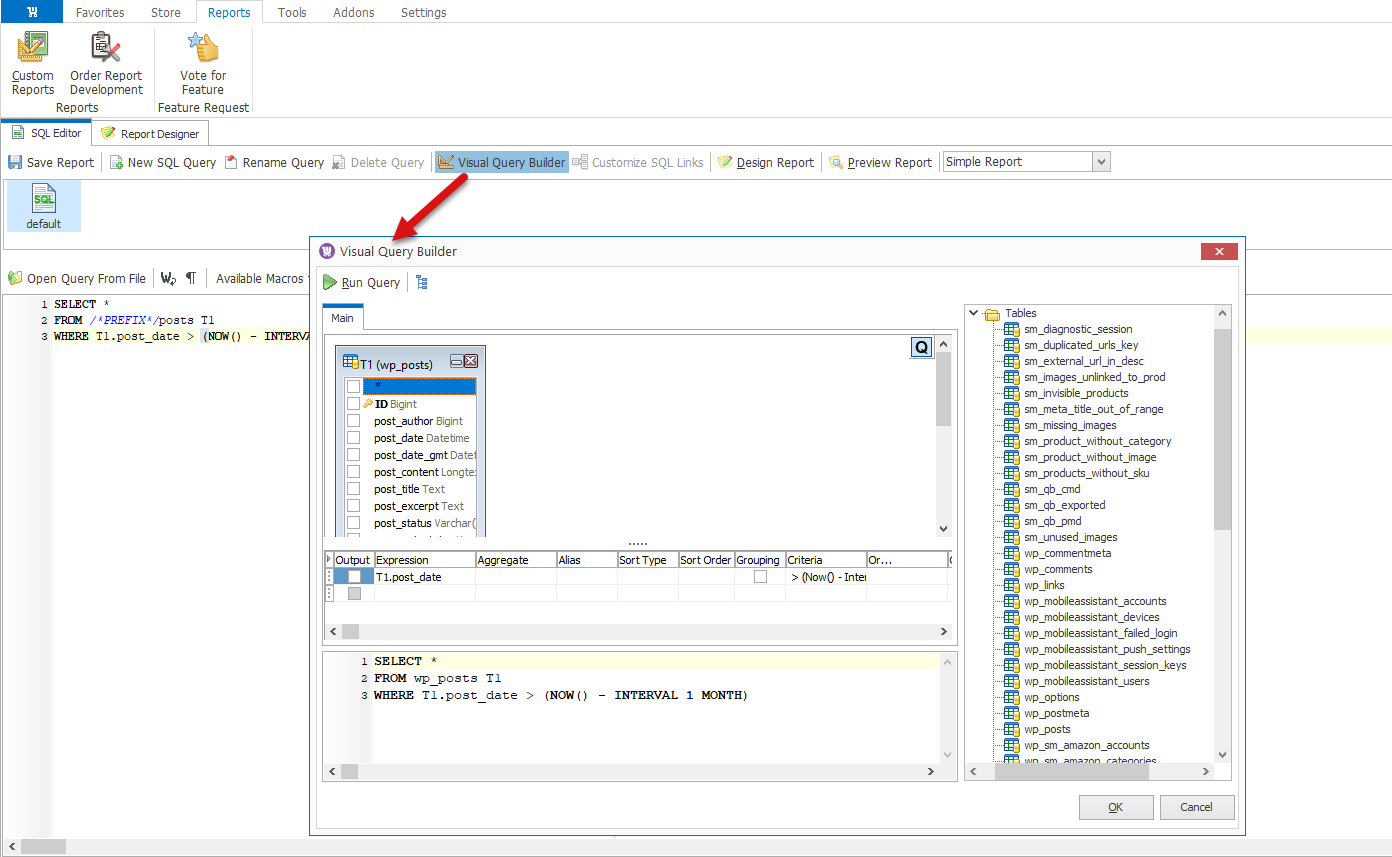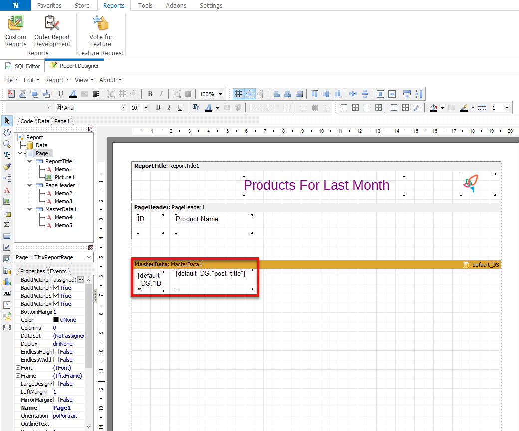 You will be transferred to the technical part, SQL Editor with the statements, that retrieve the needed data from the tables for your report. You need to move forward to Report Designer tab.