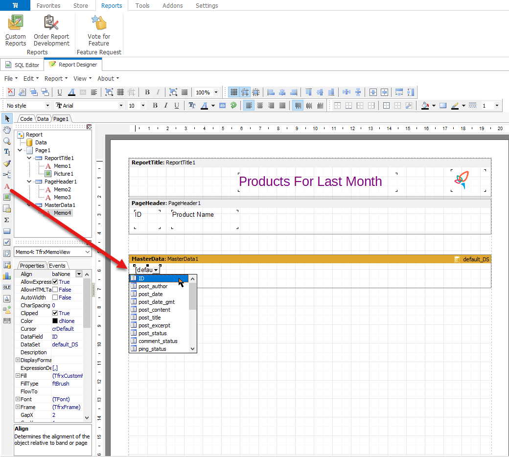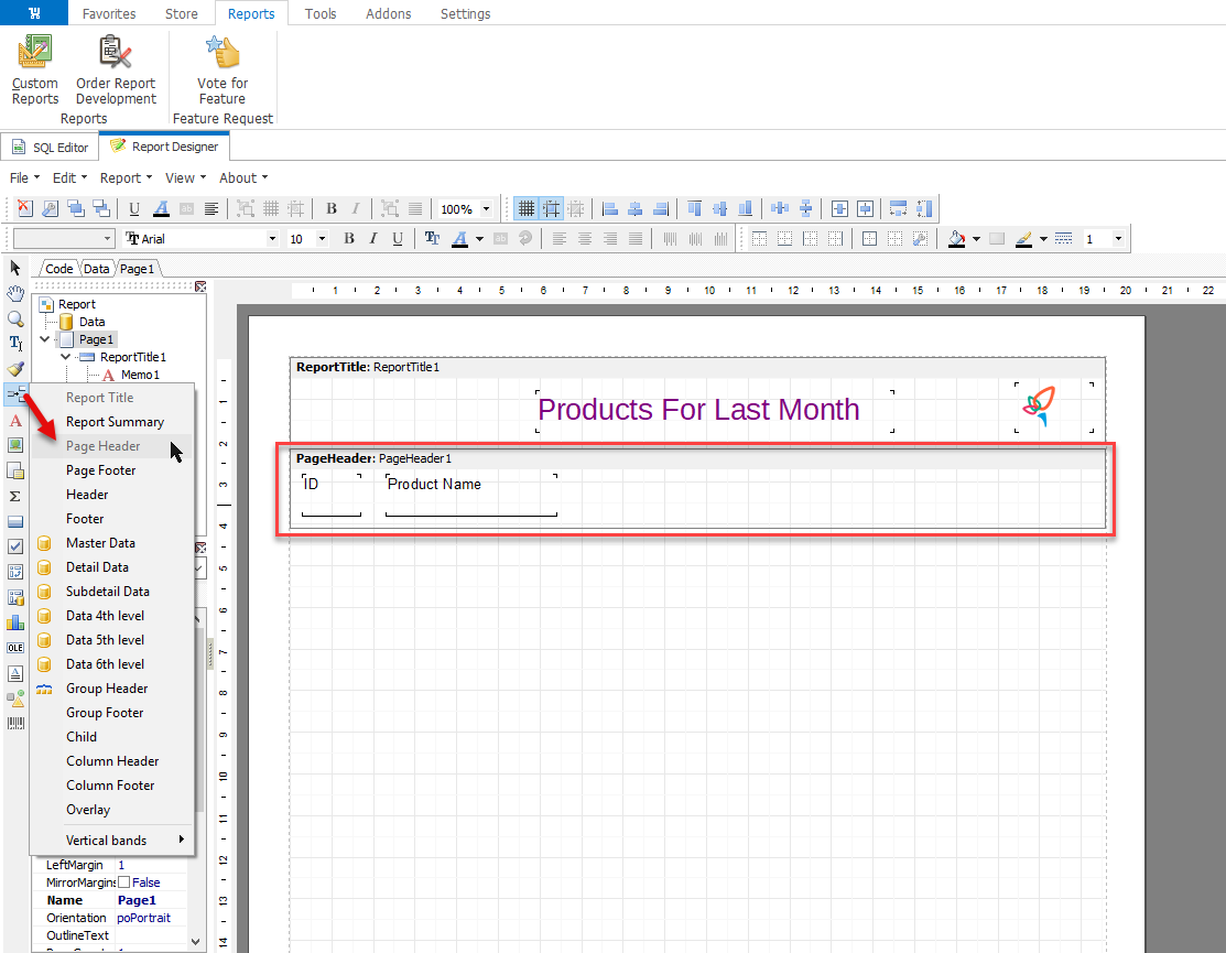 Another band we will add is Page Header, that contains the names of the columns with data in our document. For instance, we choose the text objects with ID and Product Name.