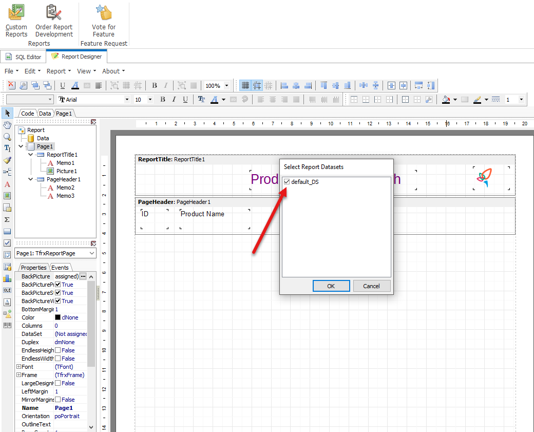 Further, we are going to add Master data band, to fill in the report with the needed data values. Before you start creating it - go to Report option on the toolbar, choose Data... from the dropdown and select the dataset your information for reports will be extracted from. Once you have ticked the needed box - apply changes with OK button.