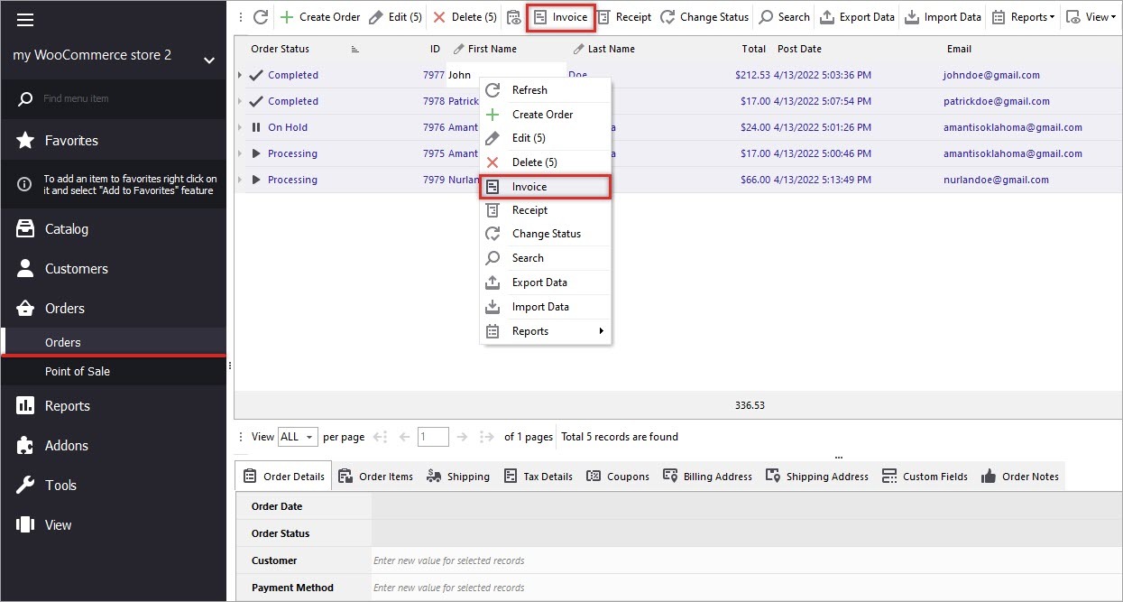 1. From Store Manager dashboard go to 'Orders' section and select an order by clicking on it, or highlight several orders to WooCommerce bulk print invoice.