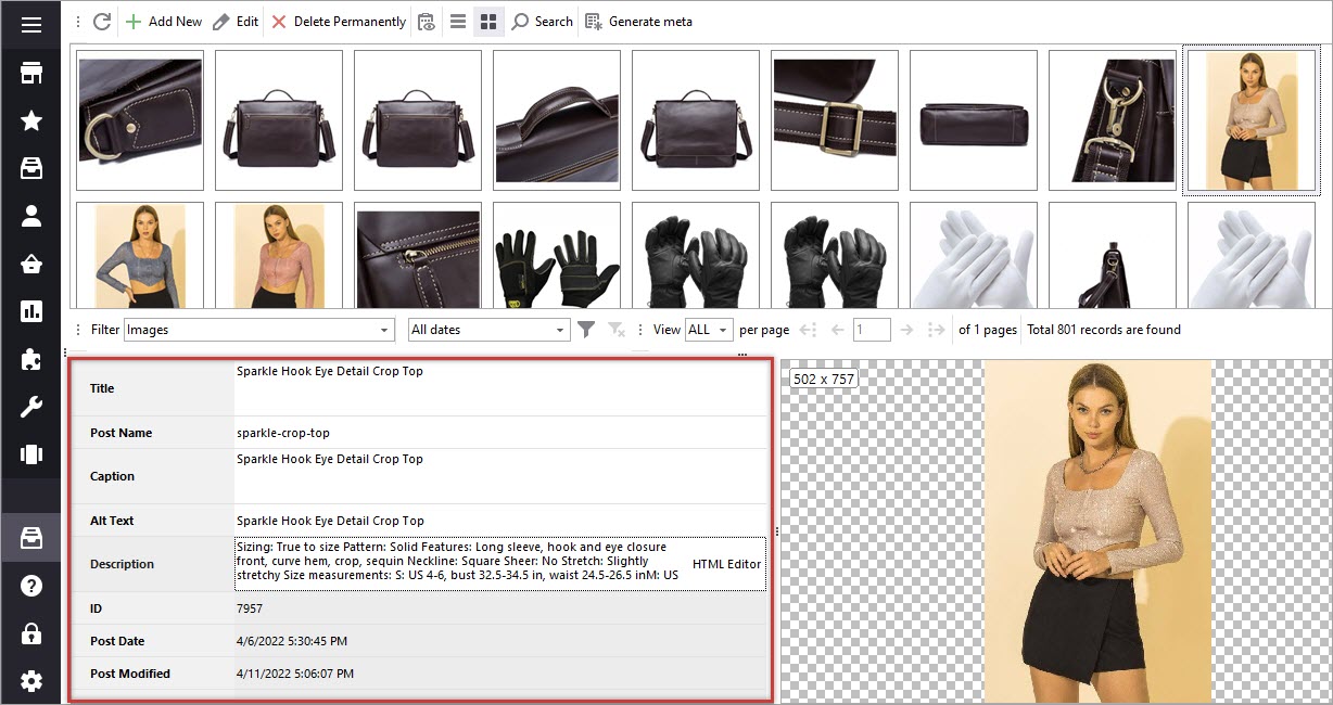 With the ‘Generate meta’ option in Store Manager, you can create necessary details based on the product info. Alt text and Caption are generated from a product title. The description is taken from a product Short description.