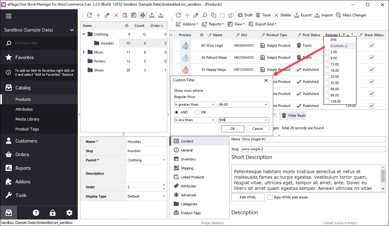 For example, imagine you want to select your goods with regular price from $99 to $999. You need to click next to price column heading and select ‘Custom’.