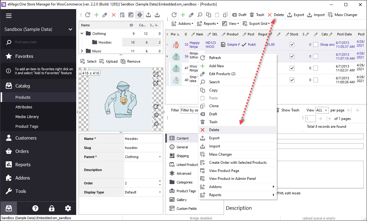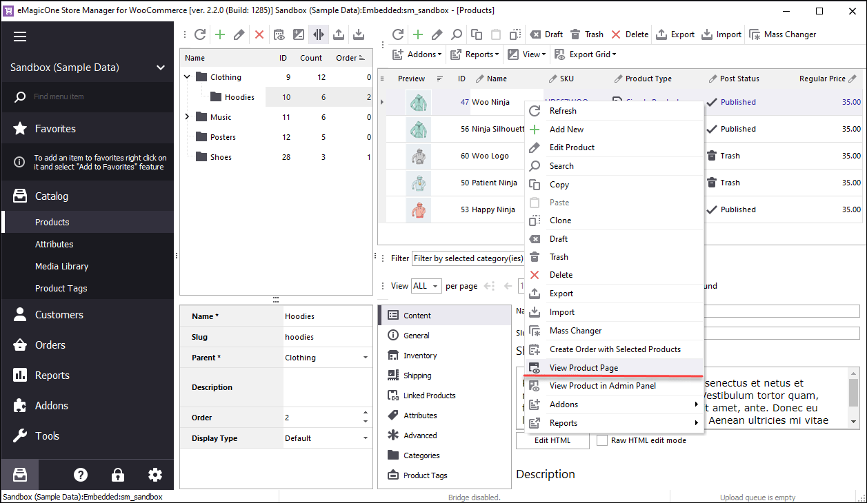 Store Manager for WooCommerce offers the set of operations you can perform to manage your products. They are presented in the form of buttons available on products toolbar or context menu (appearing after right-clicking at any product).
