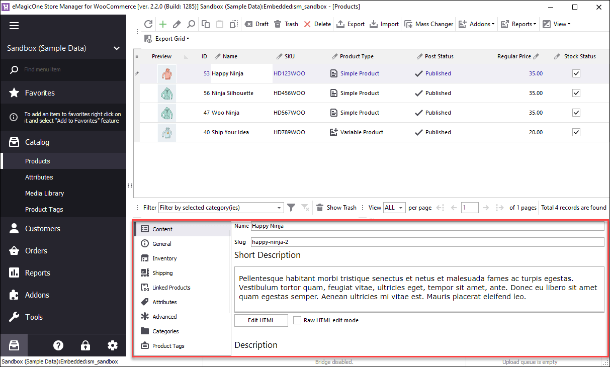 Moreover, moving up and down the product list you can view product details in catalog preview as well as in the tabs of lower grid. This way - there is no need to open each products edit form one-by-one to view or manage some data. This saves you time greatly as you do not have to browse different pages - everything is gathered in one place for your convenience.