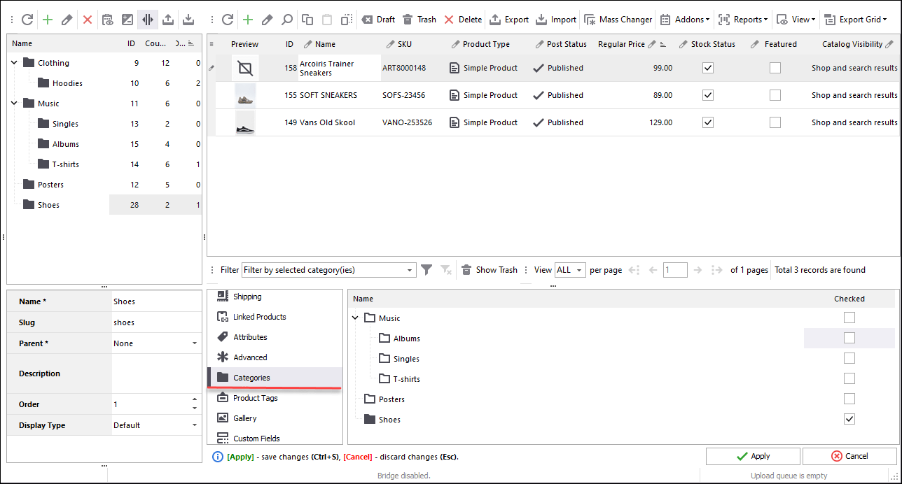 Now, let us go to the next tab of the Edit product form - Categories, that answers for the categories association. You can place your new item to one particular category, as well as to several of them at once.