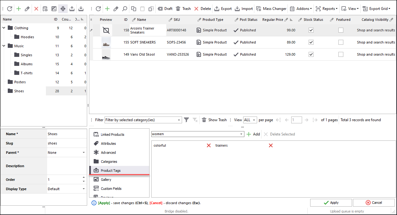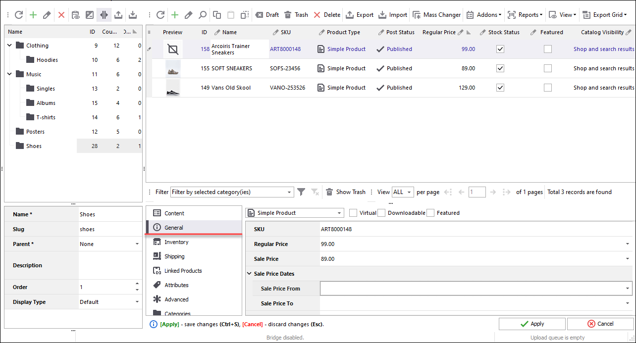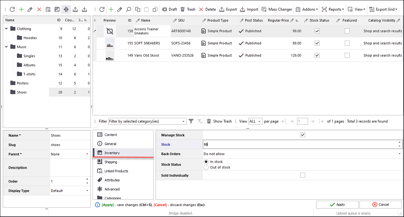 Store Manager for WooCommerce is designed to flexibly manage this type of products and offers a wide range of operations over them: add, edit, delete, search, filter, export, import, massively change item details or status.