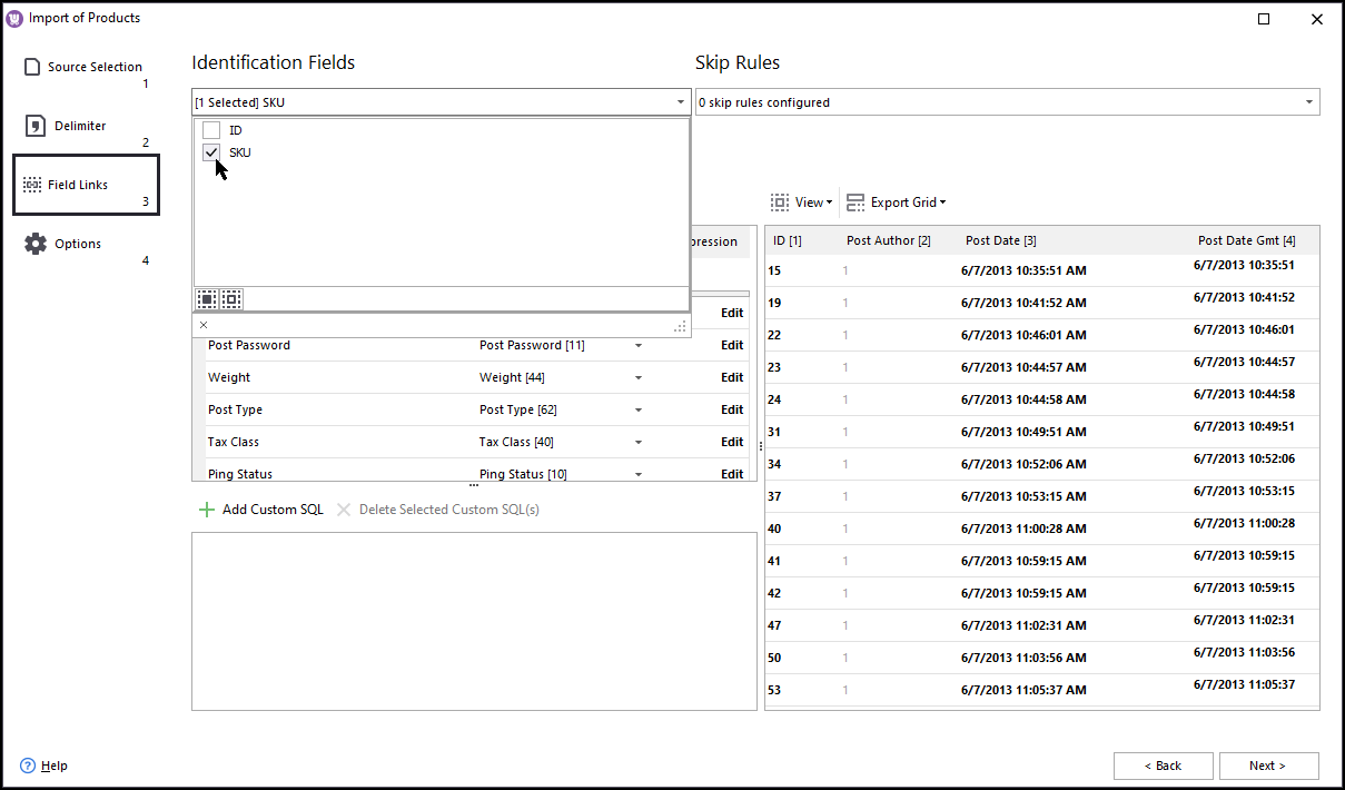 Also in this step, you have to link columns from your import file to the correct database fields. The window has two sections: the left section shows product database fields and the right section shows your file columns. To map fields, select a database field on the left and click a corresponding column from your file on the right. You can also use automapping by clicking the Auto Link All button.