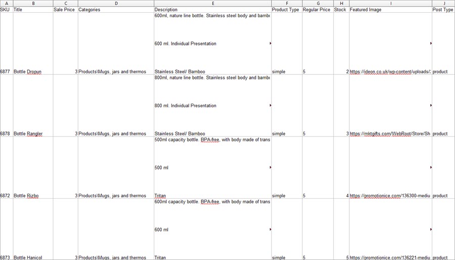 To create new products via import, you would want to include more fields to most fully present the products in the catalog. These are title, description, category, image, price, SKU, stock, product type, visibility, brand, etc. Though if needed, you can create products with minimum fields in the file and add more details later. Here is a file we're going to import. Store Manager allows importing external images, so we entered image URLs in the file. Also, pay attention that you should input the full category path: