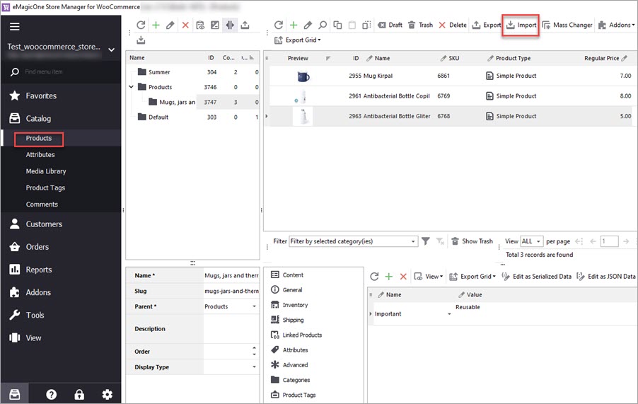 To launch WooCommerce Import Wizard, navigate to Store Manager > Catalog > Products and click the Import button: