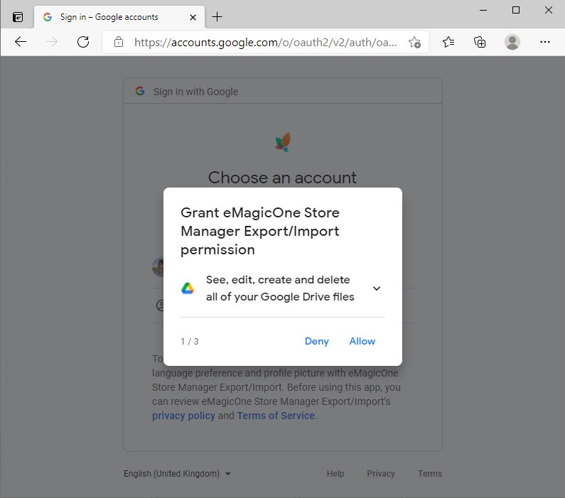 A browser with a Google signin form will open. If you’re following the steps with us, select the account you want to connect to and press “Allow” to grant access to it: