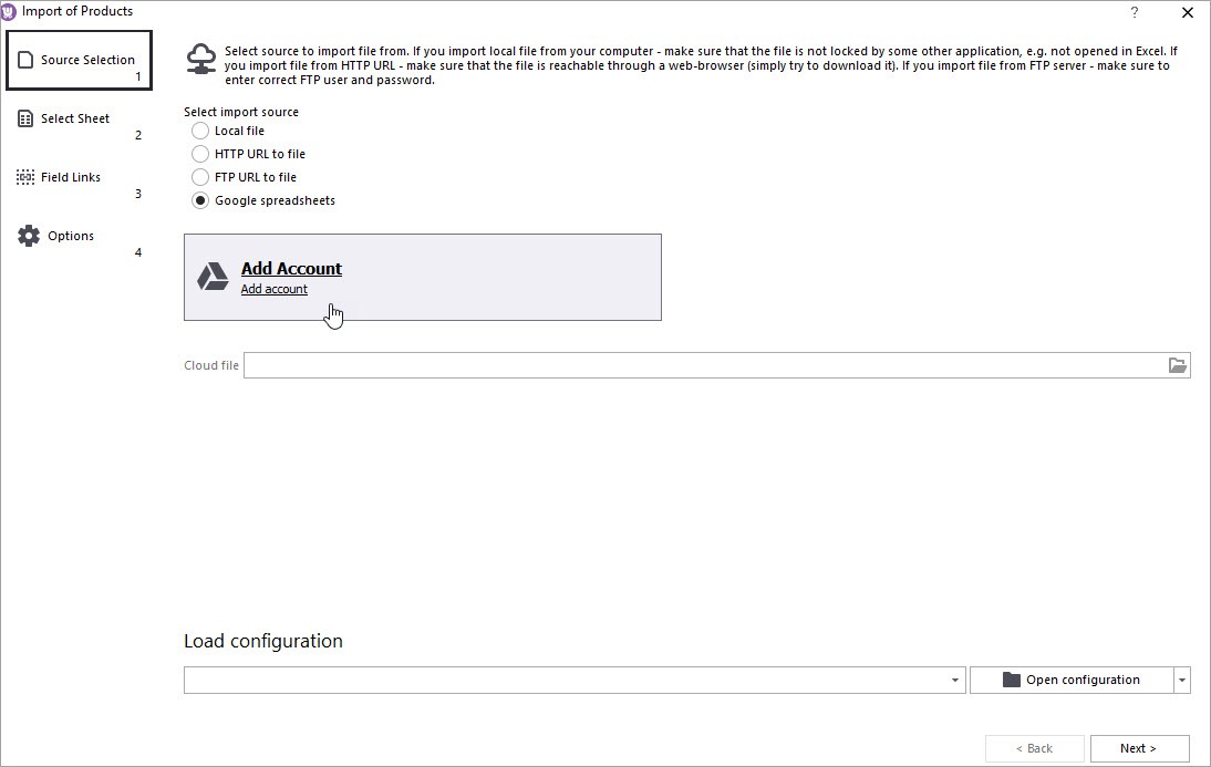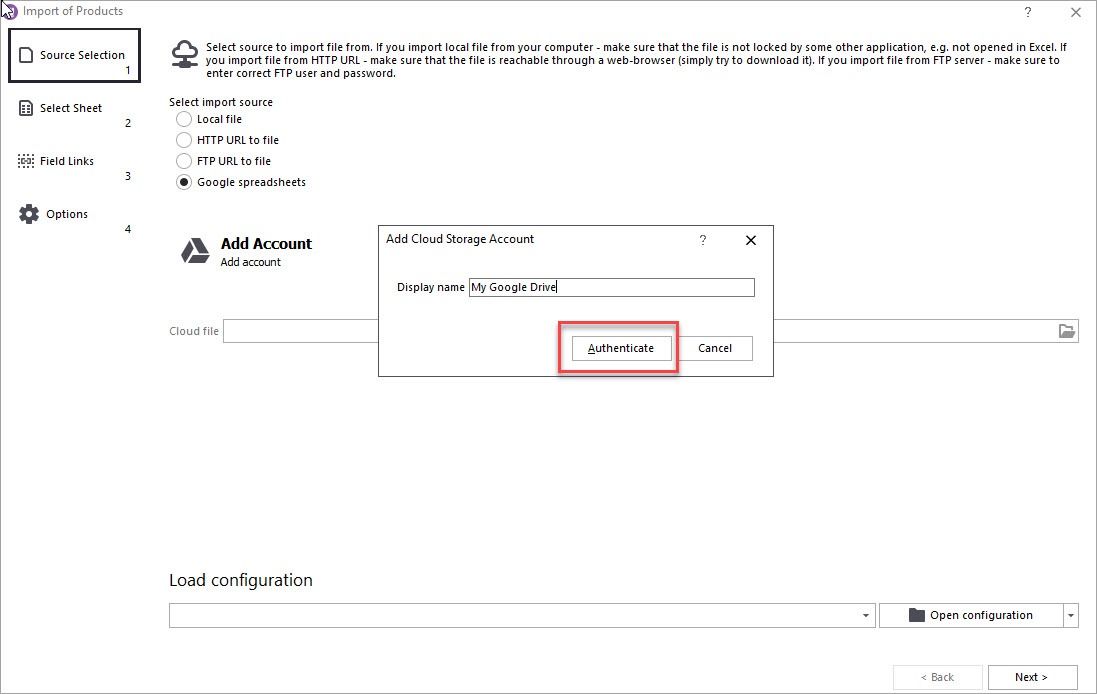 In the open wizard among the available import sources, switch to “Google Spreadsheets”. Now you can add your Google Drive:
